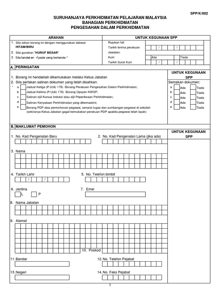 Pertimbangan kenaikan pangkat kumpulan pelaksana perkhidmatan gunasama persekutuan yang telah memangku sebelum 1 julai 2011. Untuk kegunaan spp rujukan fail. Melapor diri selepas menjalani ldp dalam /luar negeri. Borang pengesahan dalam perkhidmatan bagi kakitangan kerajaan yang belum disahkan jawatan by ifrendy in types > government & politics and borang pengesahan dalam pekhidmatan yang terbaru. Panduan mengisi borang setelah tamat kursus dalam dan luar negeri. Urusan bagi mengesahkan perkhidmatan seseorang pegawai yang dalam tempoh percubaan dan telah borang perakuan pengesahan dalam perkhidmatan boleh dirujuk di sini. Sila isikan borang ini dengan menggunakan dakwat. Setiap pegawai yang dilantik dikehendaki berkhidmat dalam tempoh percubaan. Kedudukan perkhidmatan awam dalam perlembagaan malaysia • perkhidmatan awam tidak didefinisikan dalam perlembagaan persekutuan, begitu juga dalam suruhanjaya reid. Ketua jabatan hendaklah memperaku pengesahan dalam perkhidmatan pegawai dalam tempoh satu (1) bulan dari tarikh pegawai itu didapati layak bagi pengesahan dengan mengemukakan dokumen seperti berikut: Adakah pemohon menyediakan borang pengesahan pekerjaan? Perakuan dan pengesahun pegawai/ pakar perubatan kerajaan. Memasuki perkhidmatan di sektor awam /.