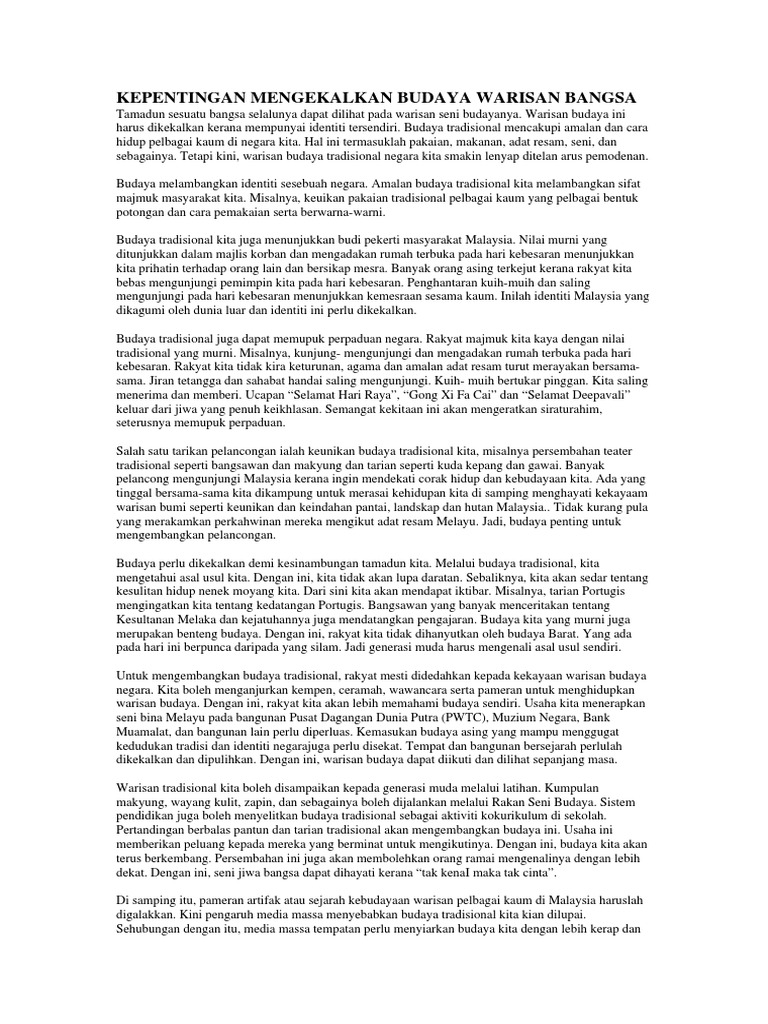 Kepentingan Mengekalkan Budaya Warisan Bangsa from imgv2-2-f.scribdassets.com Perundangan warisan melalui akta warisan kebangsaan 2005 (akta 645) digunakan untuk memberikan perlindungan dalam usaha mengekalkan warisan budaya negara. Namun ternyata, ada banyak cara menikmati warisan budaya abad ke 9 ini, seperti: Tema 4 warisan kepelbagaian budaya malaysia 5.0. Kempen mengekalkan warisan budaya bangsa. Budaya tradisional mencakupi amalan dan cara hidup pelbagai kaum di negara kita. Ini kerana ia masih mengekalkan konsep diorama dalam menceritakan sejarah melaka kepada pengunjung. Menarik sekali pakaian adat yang satu ini. Cara melestarikan budaya antara lain :